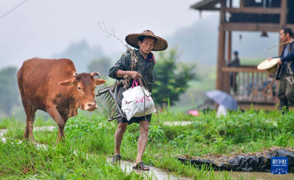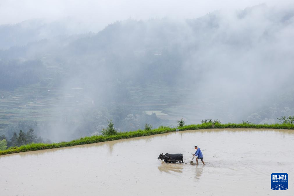 5月18日,在贵州省黎平县尚重镇洋洞村,村民在参加牛耕活动。新华社发(吴光辉 摄)