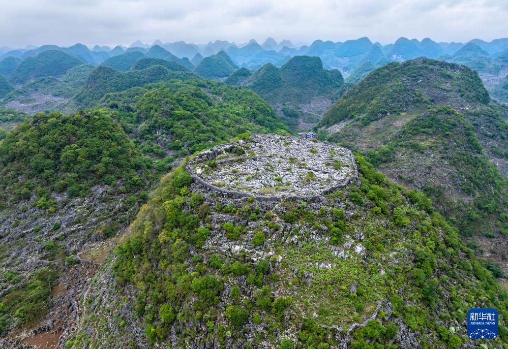 这是位于卢家营附近“消失”的山峰,山顶还留有防御营墙(无人机照片,5月16日摄)。新华社记者 刘续 摄