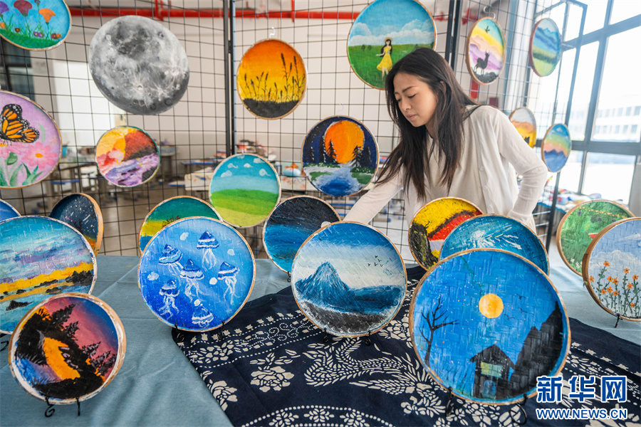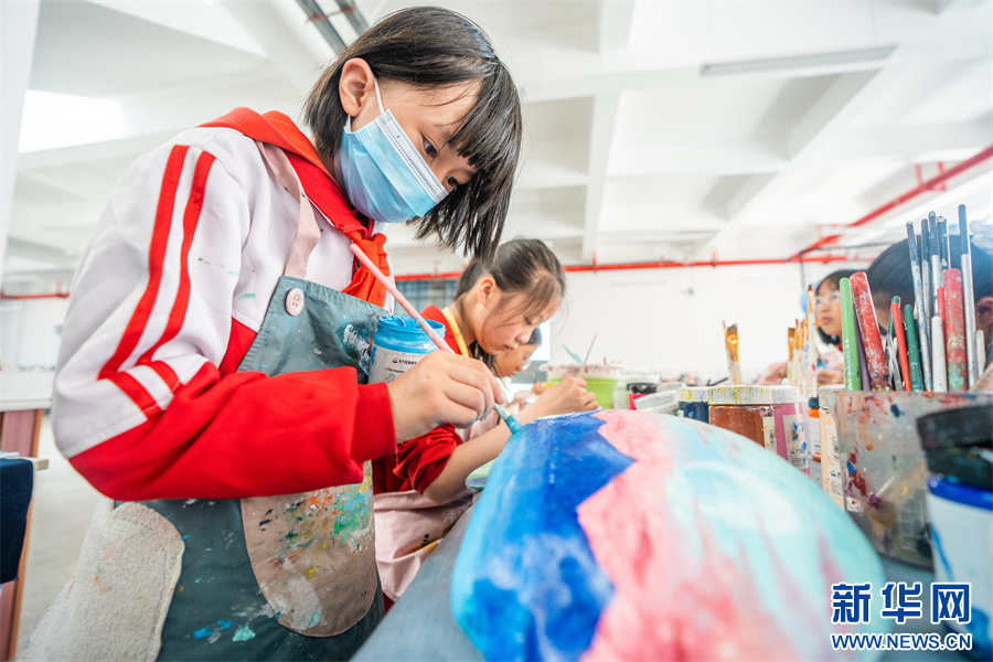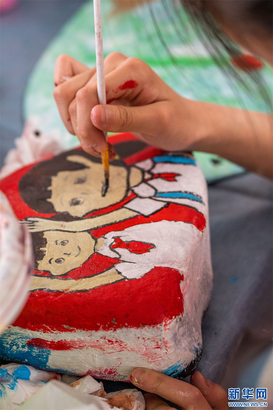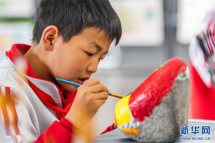 当日,贵州省毕节市威宁彝族回族苗族自治县第五小学的不少学生课后来到美术社团教室,拿出画笔、颜料,在石头上画出人物、熊猫、兔子、自然风光等图案,一块块普通的石头通过孩子们的精巧设计和描绘,被赋予新的“生命”。除在石头上绘画外,学生们还将自己的创意挥洒在簸箕、纸伞、扇子上,将它们变成一幅幅独特多彩的美术作品。