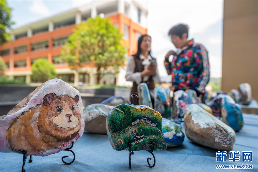 5月23日,贵州省毕节市威宁彝族回族苗族自治县第五小学集中展示孩子们在石头上的绘画作品。新华网发(罗大富 摄)