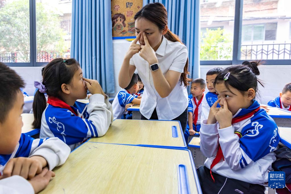 6月6日,贵州省安顺市第七小学学生在老师的指导下做眼保健操。新华社发(陈熙 摄)