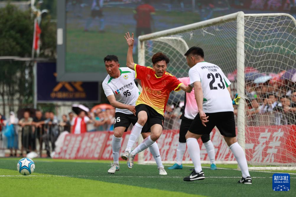 6月10日,洛邑古城足球队球员(中)和呼伦贝尔农垦芥花油足球队球员在比赛中拼抢。新华社记者 刘续 摄