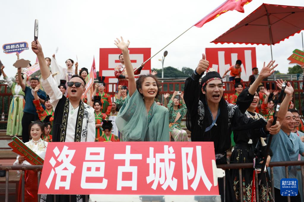 6月10日,洛邑古城足球队拉拉队在场边加油助威。新华社记者 刘续 摄