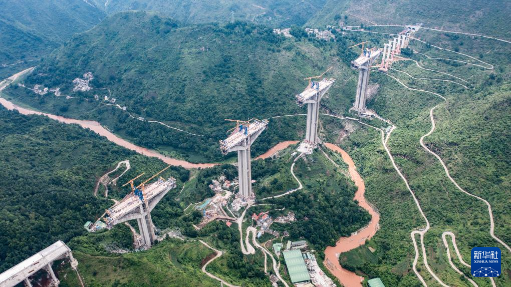 这是建设中的六枝特大桥桥墩(无人机照片,6月17日摄)。