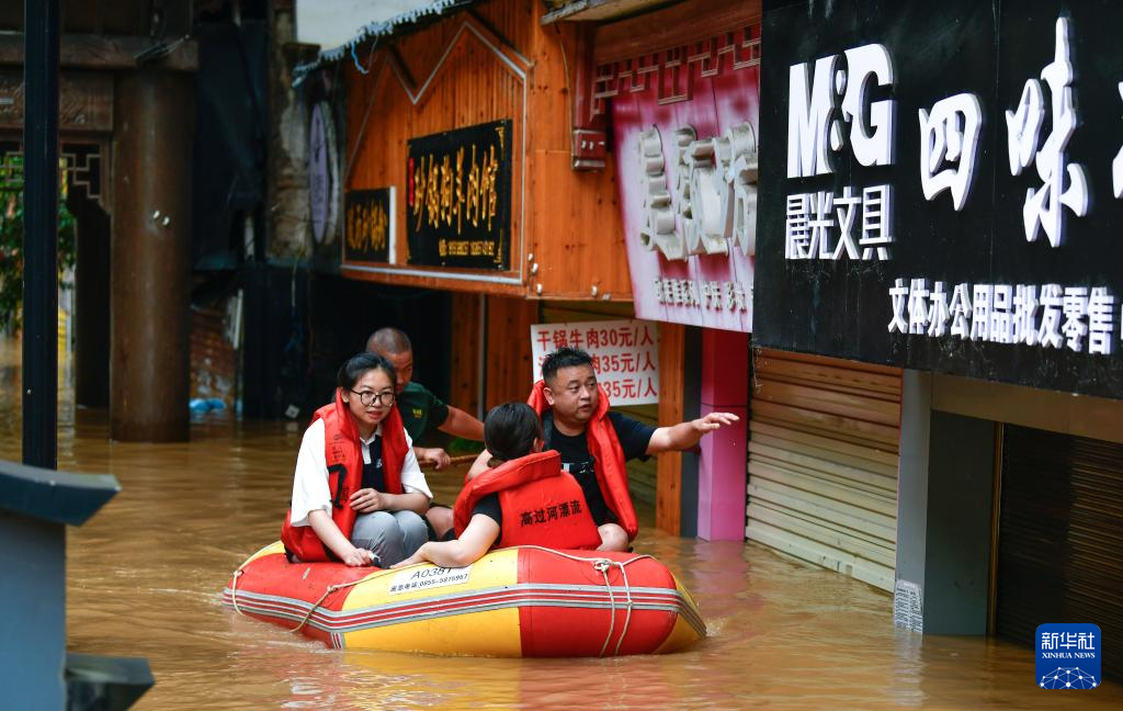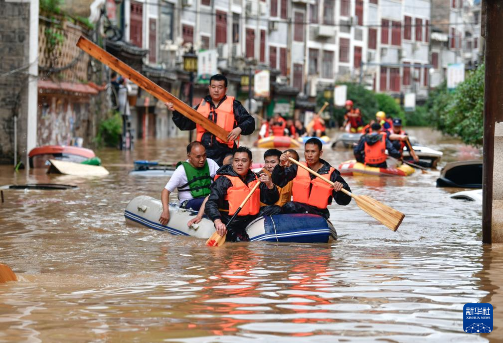 6月29日,救援队员在贵州省镇远县㵲阳镇转移被洪水围困的群众。新华社记者 杨文斌 摄