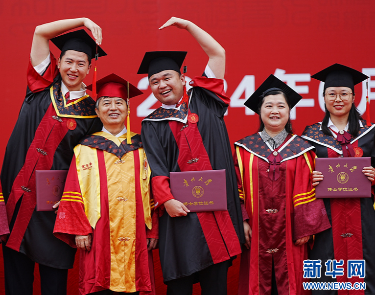 毕业生与中国工程院院士、贵州大学校长宋宝安,贵州大学党委书记杨末合影。新华网发(龙建睿 摄)