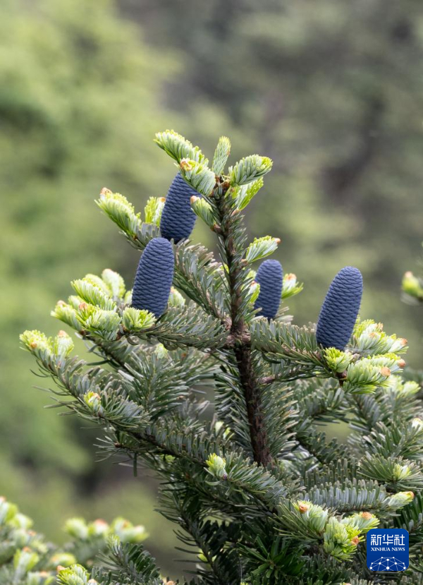 图为科研工作者在贵州梵净山国家级自然保护区拍摄的正在挂球果的梵净山冷杉(2023年6月10日摄)。(杨焱冰 摄)
