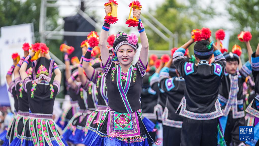 7月11日,当地群众在六盘水市六枝特区月亮河畔参加“六月六”庆祝活动时表演舞蹈。新华社记者 陶亮 摄