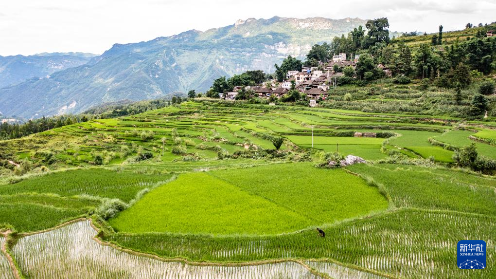 天门村的远山、树林、梯田、民居构成了美丽的田园画卷(7月16日摄,无人机照片)。新华社记者 陶亮 摄