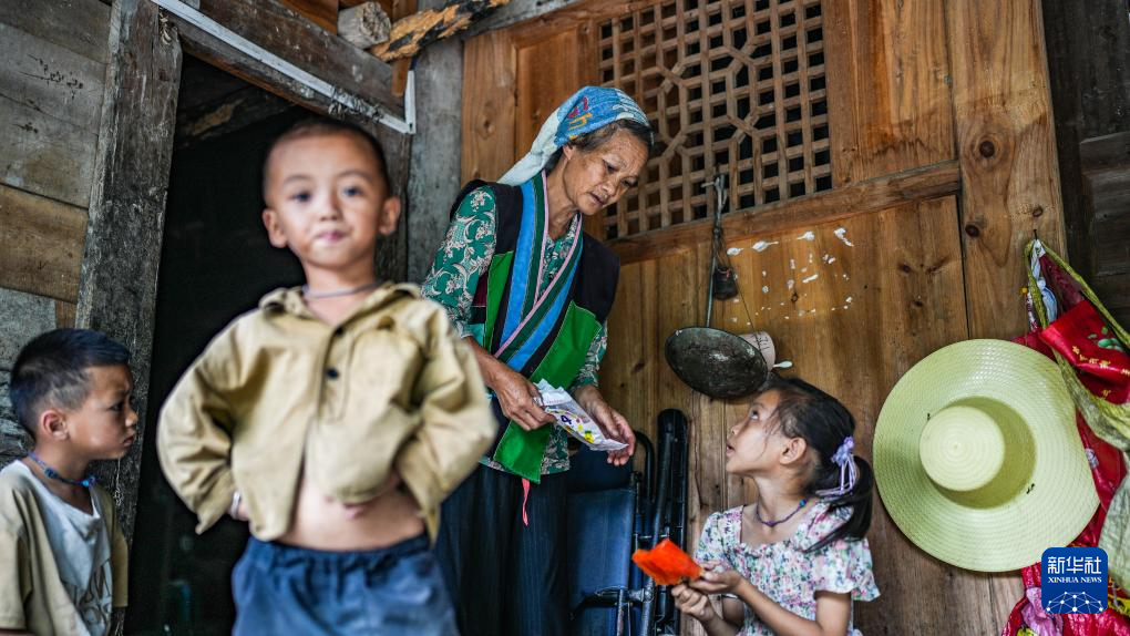 天门村村民陆凤给孙女和孙子发冰棒(7月16日摄)。新华社记者 陶亮 摄