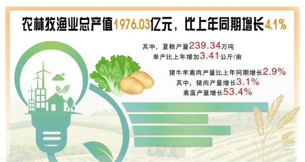 7月25日发布的全省上半年经济数据显示,农林牧渔业总产值1976.03亿元,比上年同期增长4.1%。夏粮产量239.34万吨,单产比上年增加3.41公斤/亩。猪牛羊禽肉产量比上年同期增长2.9%,其中,猪肉产量增长3.1%。禽蛋产量增长53.4%。
