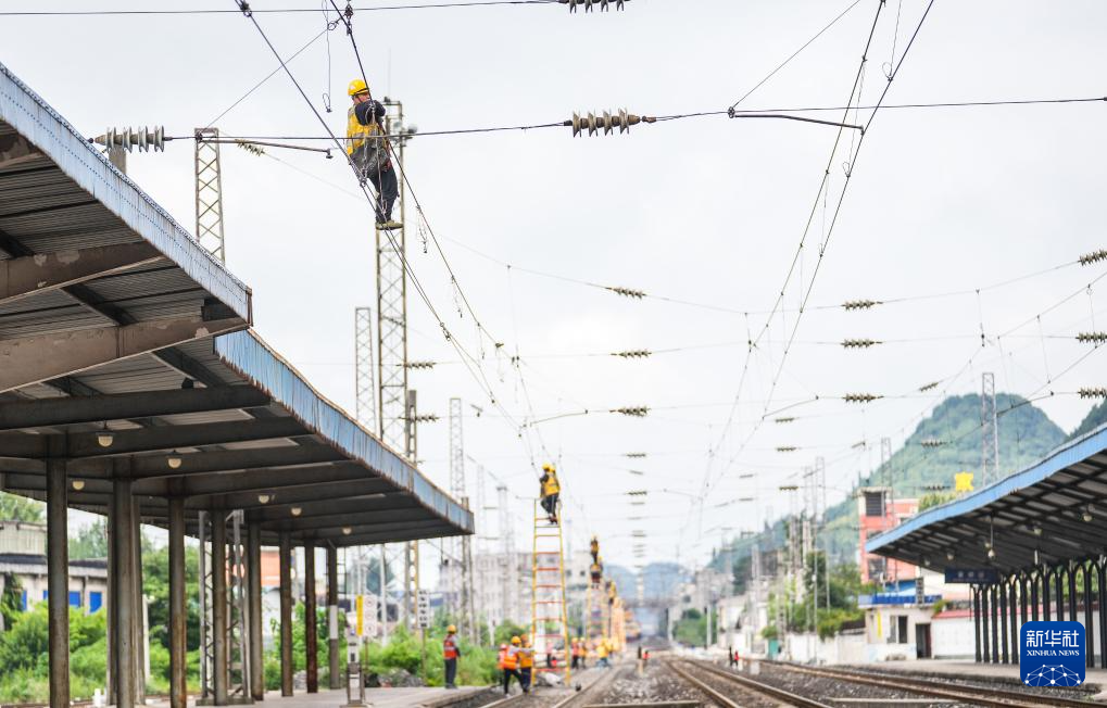 8月6日,工人在安顺站进行接触线更换施工。新华社记者 陶亮 摄