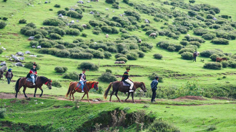 游客在六盘水市钟山区明湖国家湿地公园游玩(8月7日摄,无人机照片)。新华社记者 陶亮 摄