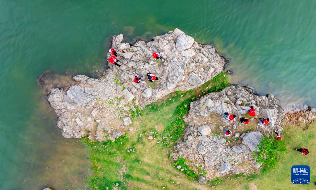 8月15日,大学生志愿者在贵州省黔西市新仁苗族乡化屋村乌江畔清理垃圾(无人机照片)。新华社发(范晖摄)