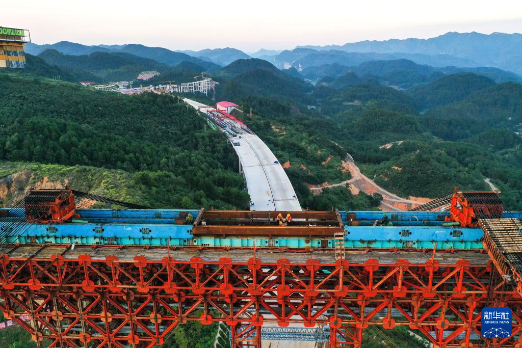这是8月21日拍摄的贵阳至平塘高速公路马场河特大桥施工现场(无人机照片)。新华社记者 杨文斌 摄