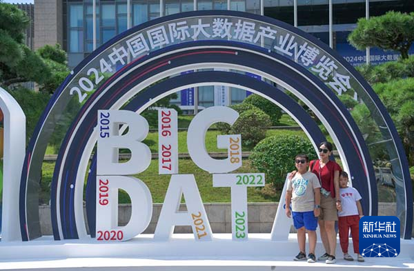 8月28日,市民在2024中国国际大数据产业博览会开幕式会场外留影。