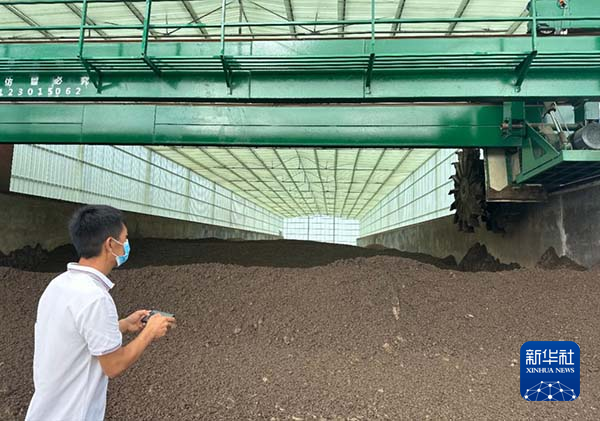 8月25日,在贵州省兴仁市城南街道保驹村,蛋鸡养殖基地经营者刘天涛通过手机操作设备处理鸡粪。新华社记者 李凡 摄