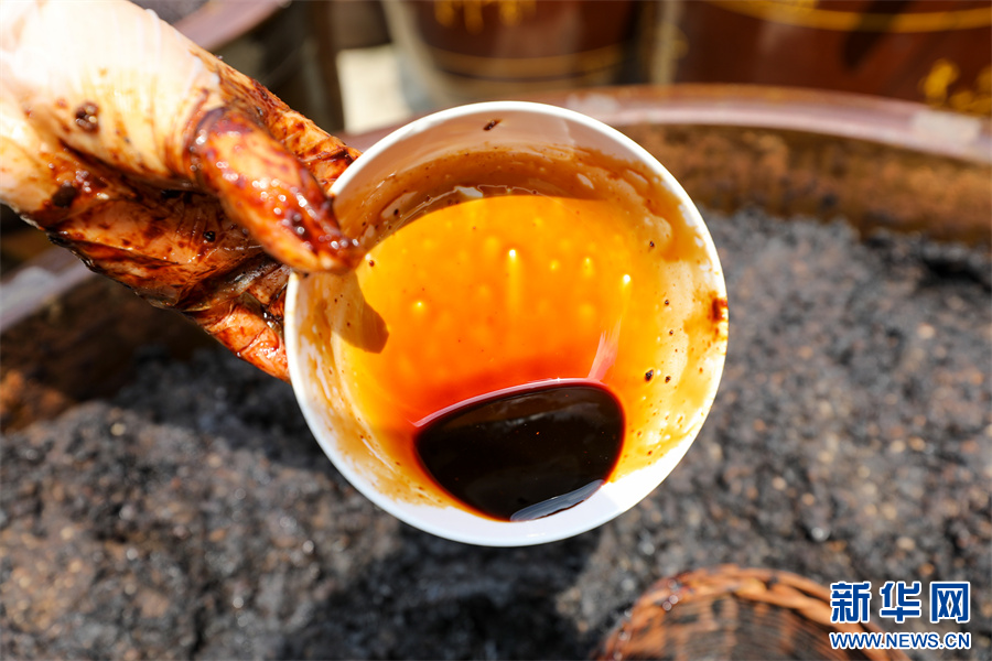 村民在贵州省铜仁市江口县民和镇艾坪村一家古法酱油加工厂翻晒黄豆酱料(8月29日摄)。新华网发(李鹤 摄)