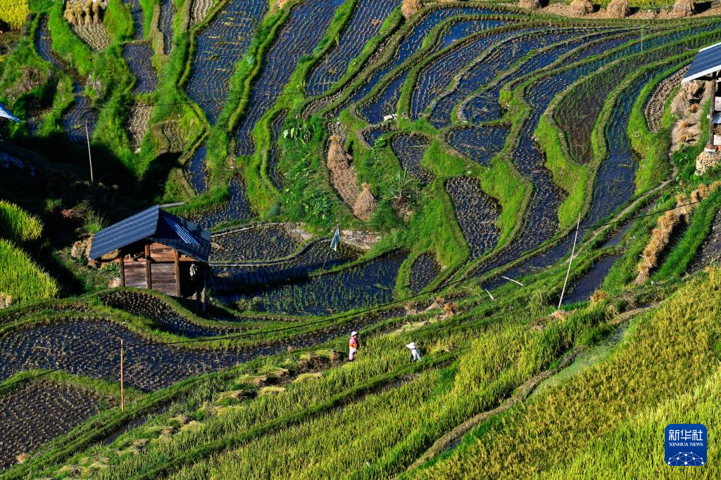 9月4日,村民在贵州省从江县加榜梯田里收获水稻。新华社发(吴德军摄)