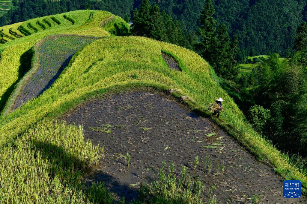 近日,位于月亮山区的贵州省从江、榕江等县梯田种植的水稻陆续迎来收获季节,当地农民抓住晴好天气收割、搬运、晾晒稻谷,确保秋粮及时归仓。