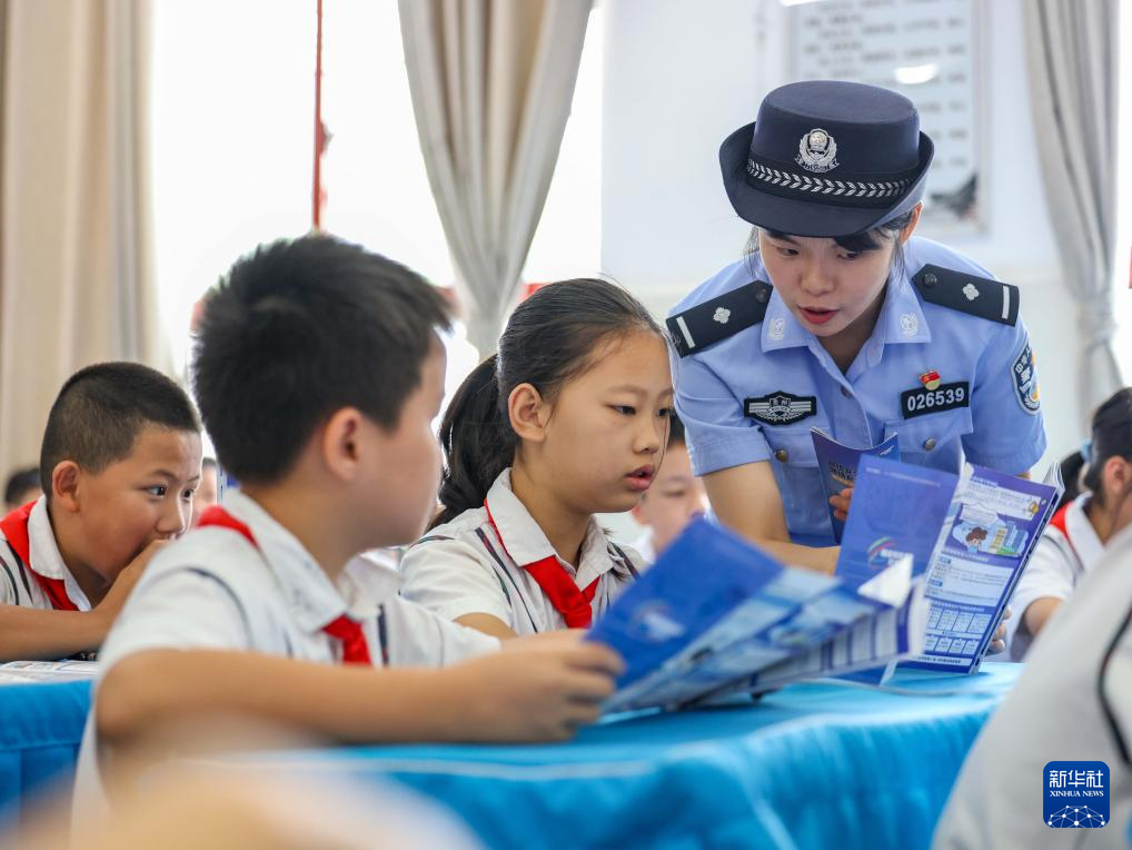 9月11日,公安民警在贵州省铜仁市玉屏侗族自治县印山民族小学给学生讲解网络安全知识。新华社发(胡攀学 摄)