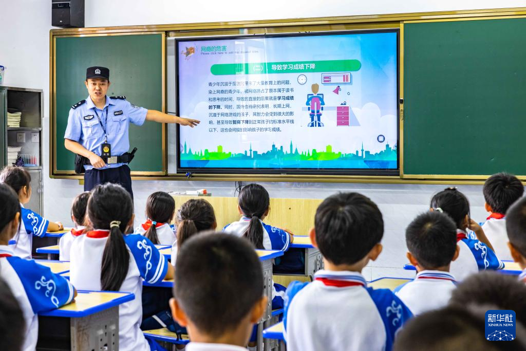 9月11日,贵州省安顺市公安局西秀分局民警在安顺市第七小学为学生讲解不良上网习惯的危害。新华社发(陈熙 摄)