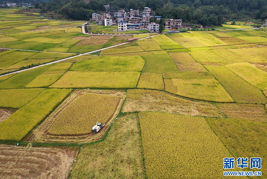 9月10日,贵州省黔东南苗族侗族自治州施秉县城关镇上翁哨村村民在收割水稻。新华网发(磨桂宾 摄)