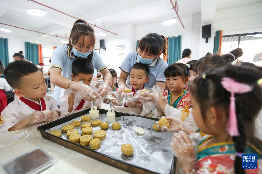 9月12日,贵州省黔南布依族苗族自治州都匀市青云湖幼儿园的老师和孩子们一起制作月饼。新华社发(肖伟 摄)