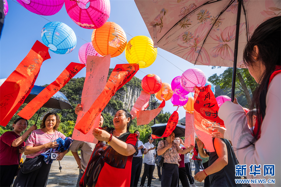 9月13日,群众在贵州省毕节市织金县平远古镇参加猜灯谜活动。