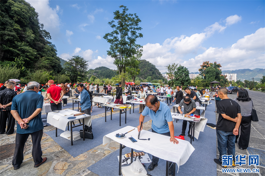 9月13日,在贵州省毕节市织金县平远古镇,书画爱好者在进行书画创作。新华网发(罗大富 摄)
