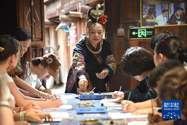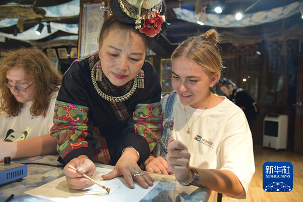 新华社贵阳9月18日电(记者骆飞、袁睿)中秋节假期,苗族妇女李文芳家的吊脚楼里十分热闹,一群来自美国的青少年正围坐在一起,认真跟着她学习蜡染制作技艺。