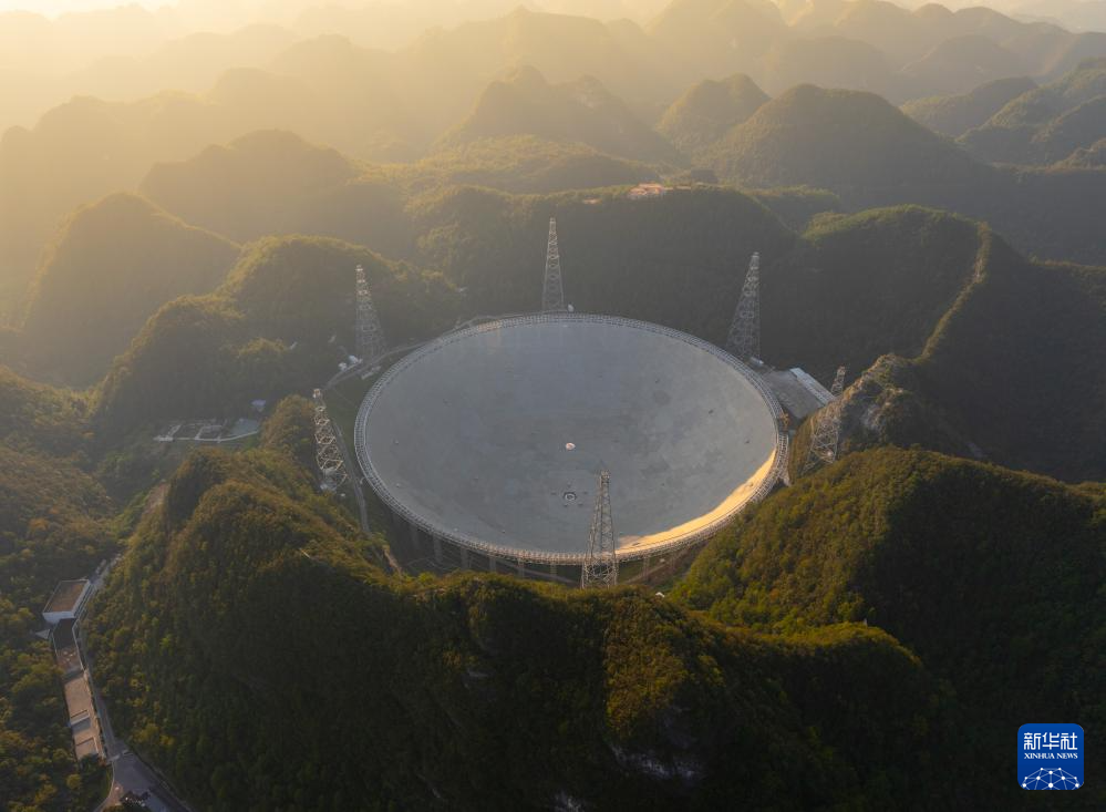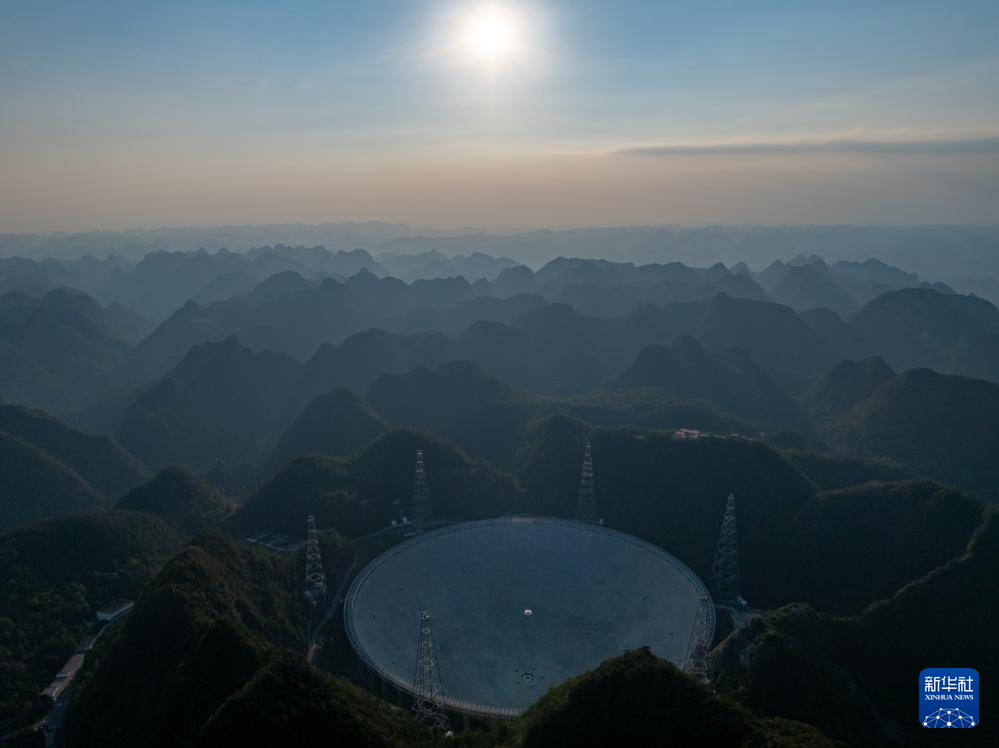 中国天眼在落日余晖中(无人机照片,维护保养期间拍摄,9月25日摄)。