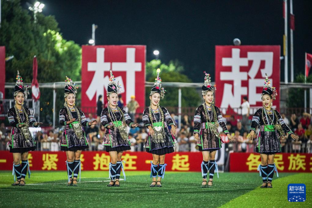 9月28日,榕江县侗族大歌队的演员们在“村超”足球场上表演。新华社记者 陶亮 摄