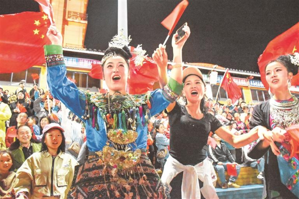 10月1日晚,在榕江县“村超”球场,人头攒动,气氛热烈。比赛间隙的国庆专场演出,观众手中挥动的红旗,让现场变成一片红色的海洋。