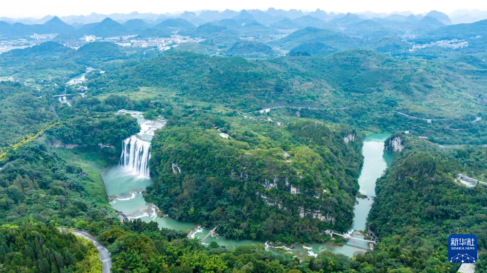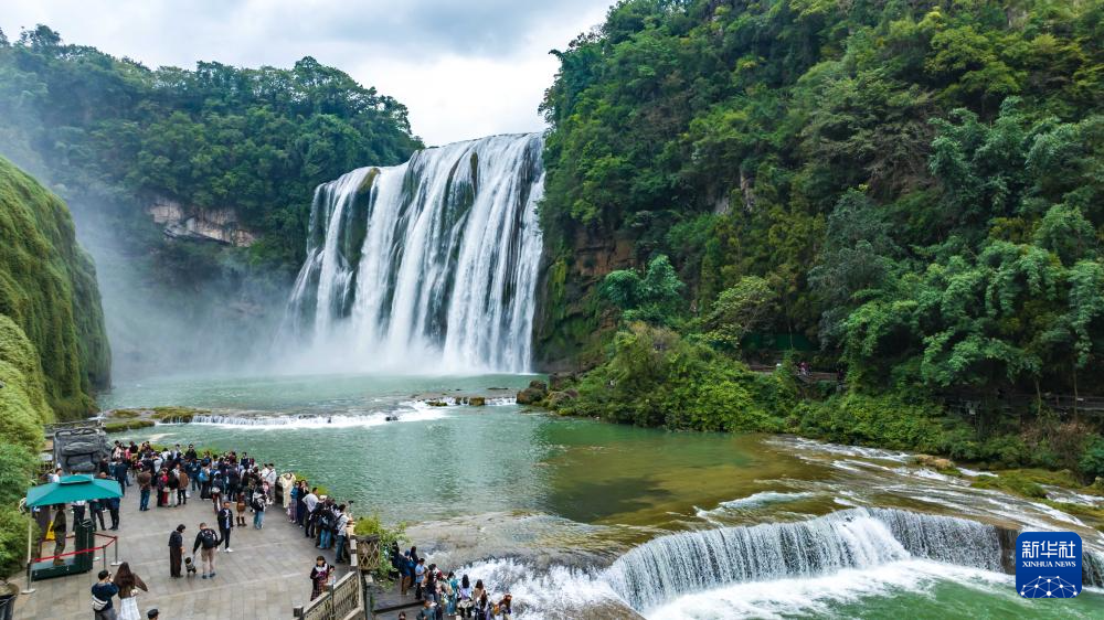 10月7日,游客在贵州省安顺市黄果树瀑布景区游览(无人机照片)。新华社发(陈熙 摄)