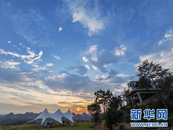 图为游客在荔波凤凰山度假康养露营基地的太空舱和帐篷边享受日落。