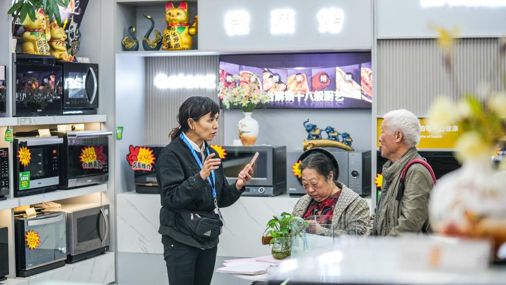 销售人员在向市民推介以旧换新商品(10月11日摄)。