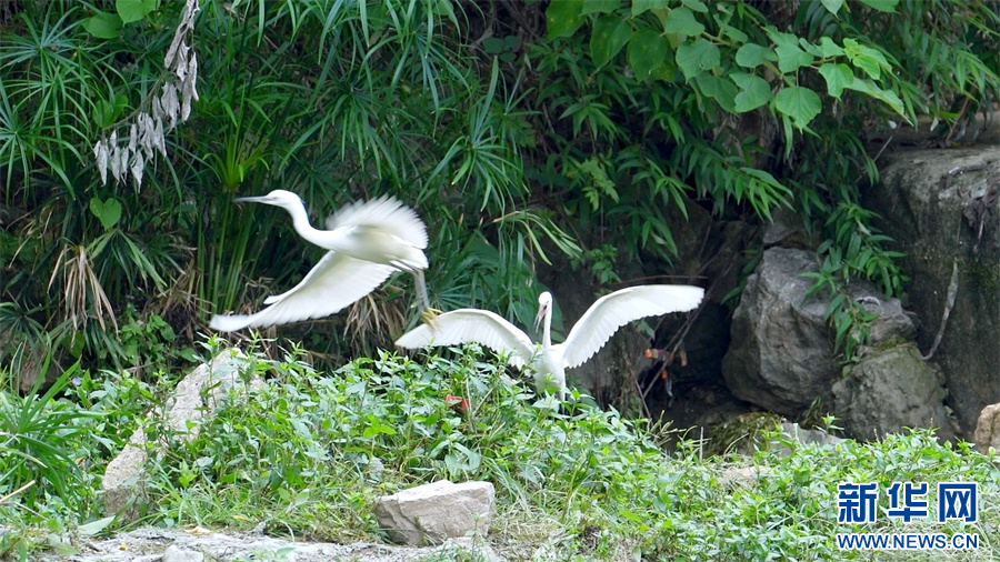 贵阳市南明区红岩桥旁翩跹飞舞的白鹭。新华网发(王强 摄)