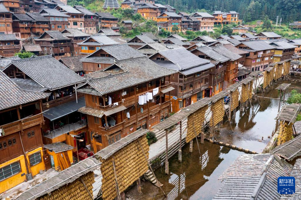 金秋时节,贵州省黔东南苗族侗族自治州从江县高增乡占里村侗族村民将丰收的糯稻谷晾晒在禾晾架上,禾晾与侗寨房屋相映成景。占里村自古就有禾晾“晒秋”的传统,如今,禾晾“晒秋”已成为当地秋日里的一张特色旅游名片,吸引游客前往观赏。