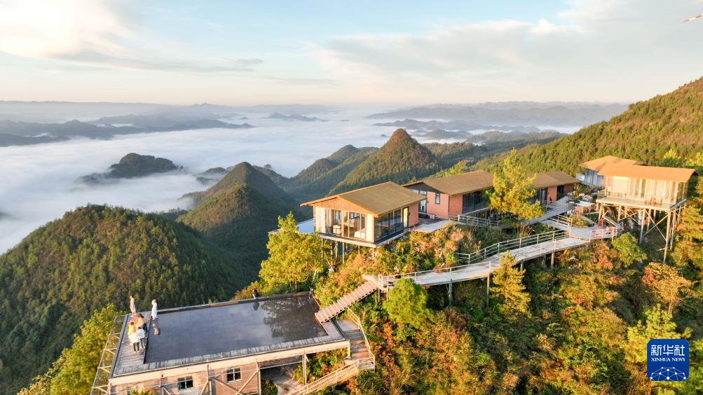 10月24日,游客在贵州省开阳县高寨乡牌坊村一家民宿观赏云海(无人机照片)。新华社发(袁福洪 摄)