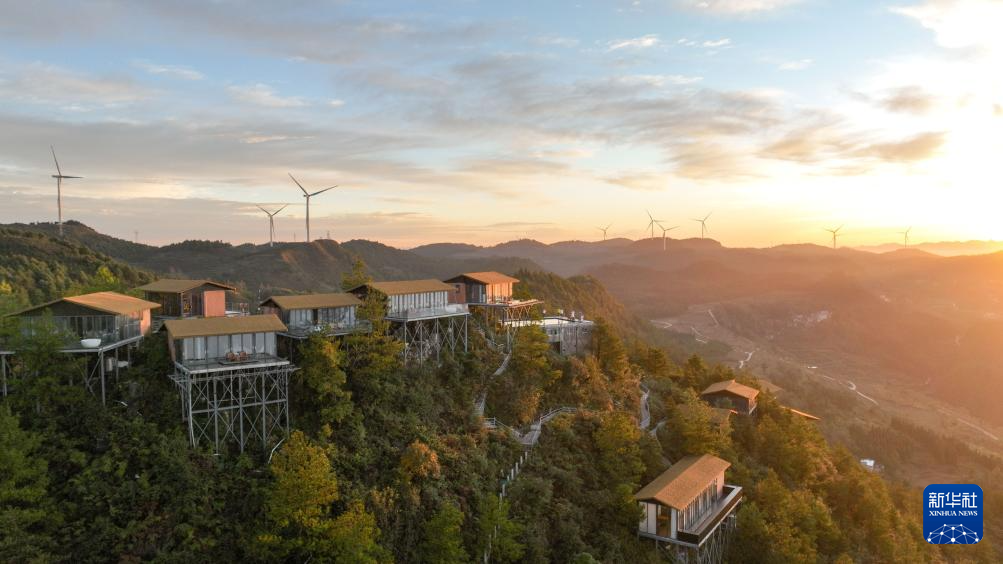 这是10月24日在贵州省开阳县高寨乡牌坊村一家民宿拍摄的日出景色(无人机照片)。新华社发(袁福洪 摄)