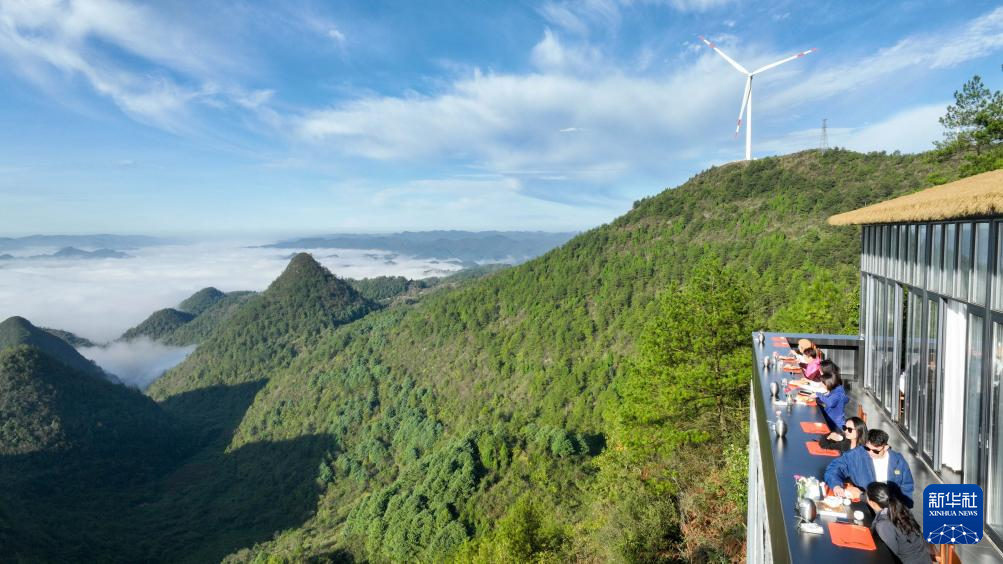 10月24日,游客在贵州省开阳县高寨乡牌坊村一家民宿用餐(无人机照片)。新华社发(袁福洪 摄)