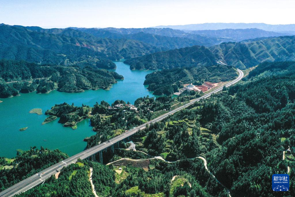 10月25日,车辆在贵州剑黎高速固本互通附近行驶(无人机全景照片)。新华社记者 杨文斌 摄