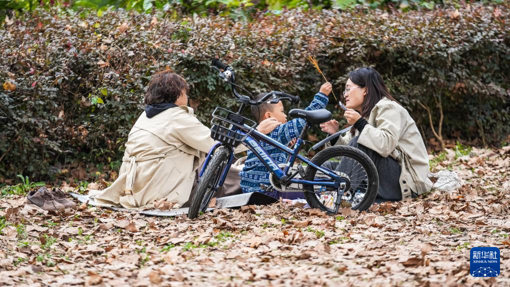 10月27日,市民在贵阳市花溪国家城市湿地公园黄金大道席地而坐。新华社记者 陶亮 摄