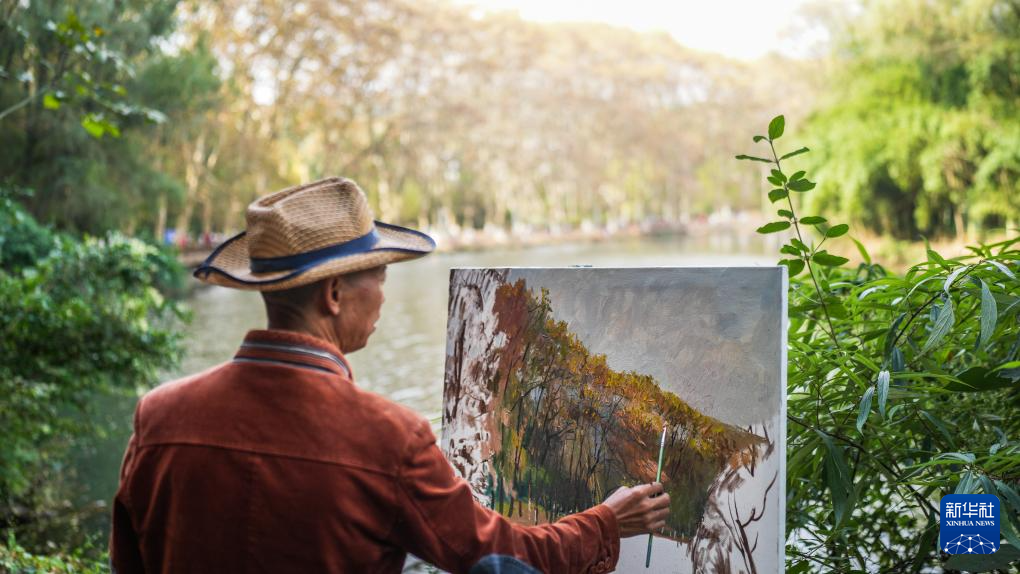 10月27日,市民在贵阳市花溪国家城市湿地公园黄金大道绘画。新华社记者 陶亮 摄
