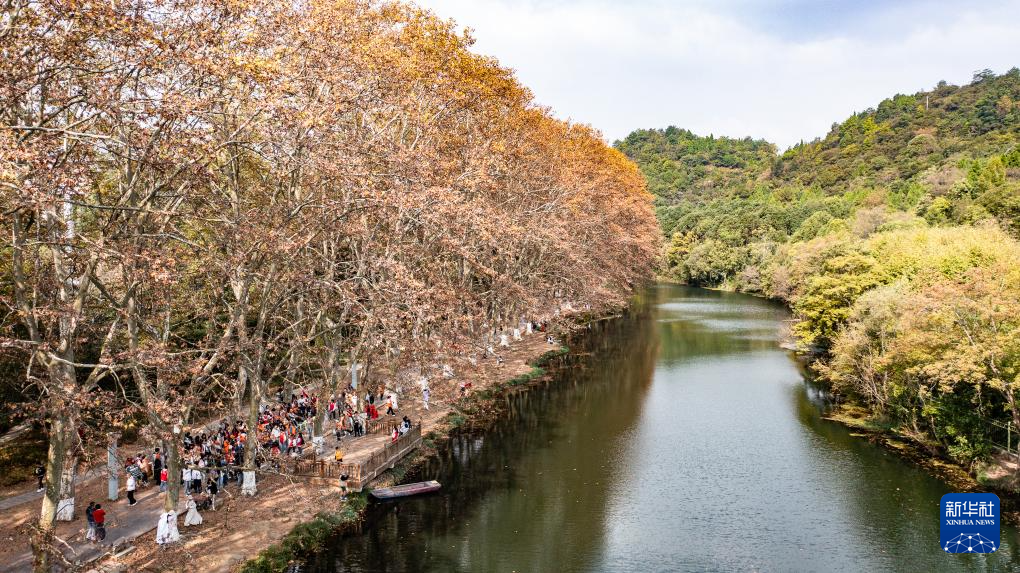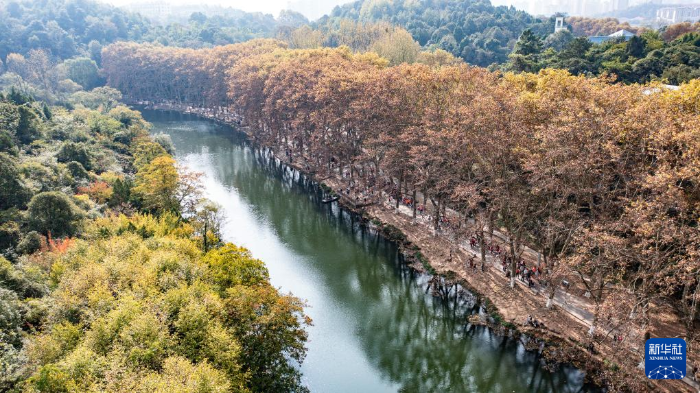 市民在贵阳市花溪国家城市湿地公园黄金大道观赏游玩(10月27日摄,无人机照片)。新华社记者 陶亮 摄