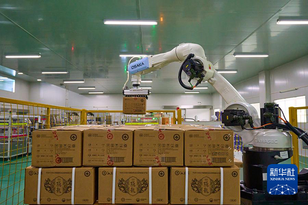 贵州山王果健康实业有限公司5G智慧工厂全自动包装线正在工作。(新华社发)