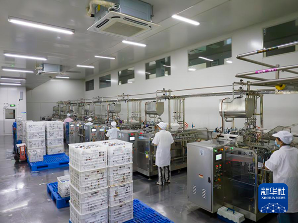 贵州山王果健康实业有限公司5G智慧工厂全自动灌装机生产现场。(新华社发)