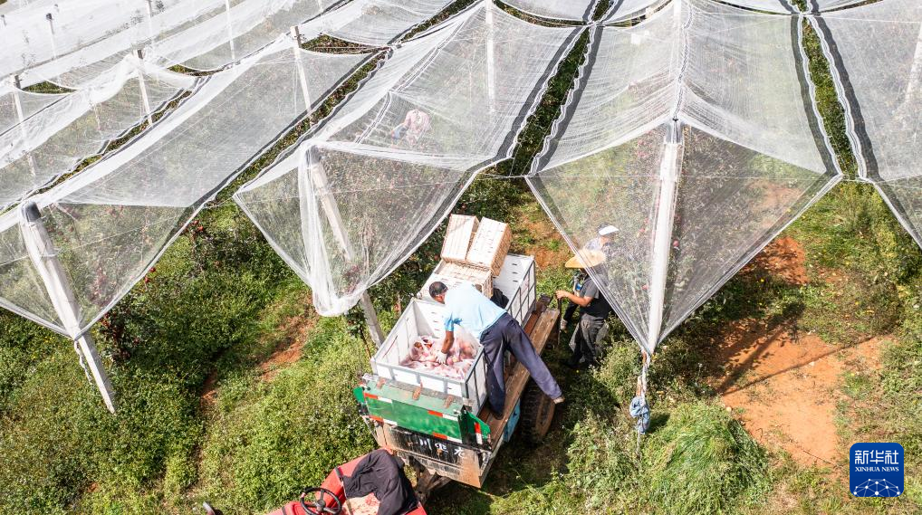 村民在威宁彝族回族苗族自治县黑石头镇雨田果园转运苹果(10月30日摄,无人机照片)。