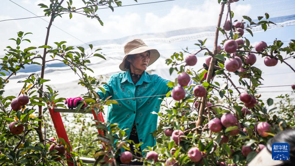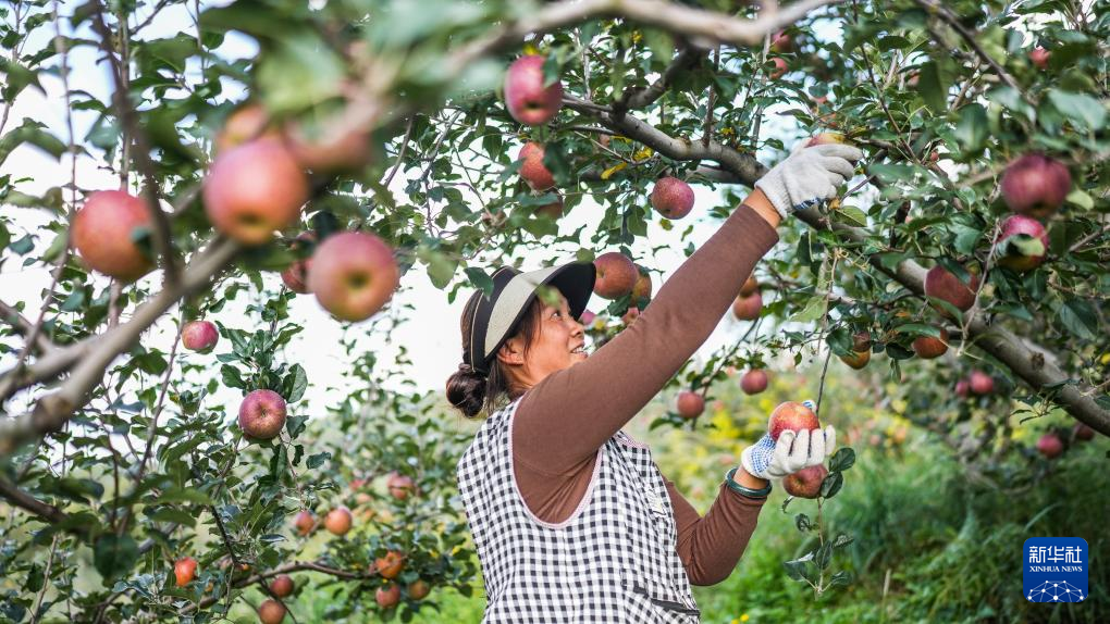 村民在威宁彝族回族苗族自治县黑石头镇新河社区采收苹果(10月30日摄)。新华社记者 陶亮 摄